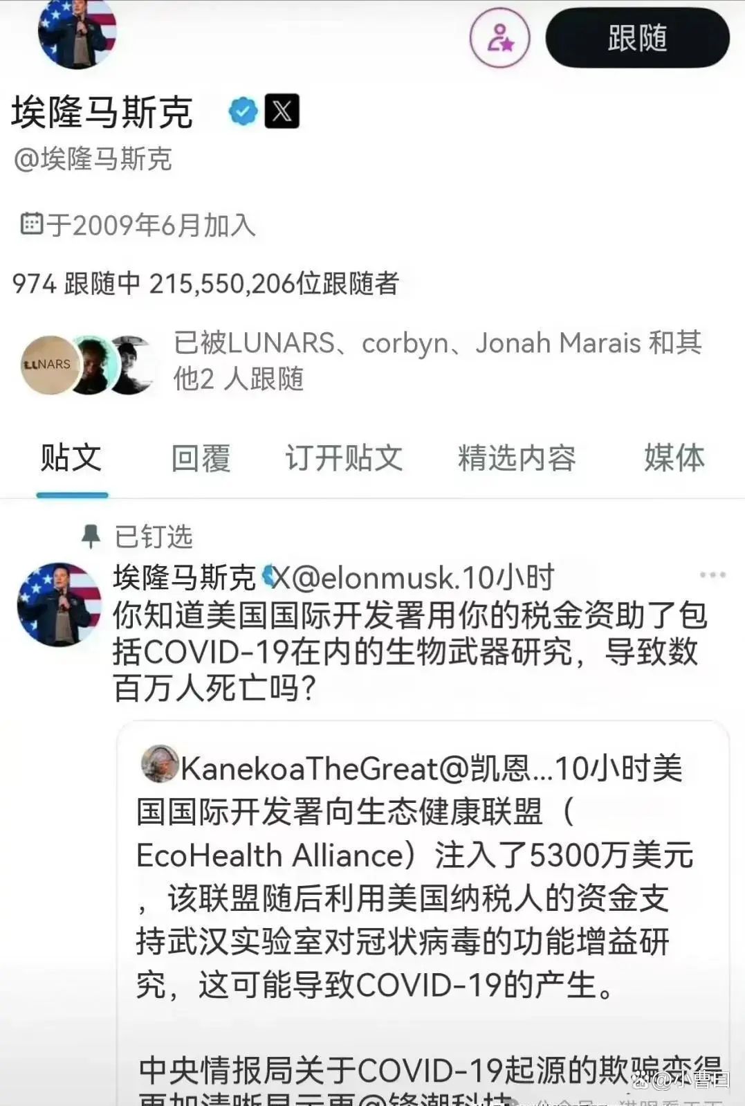 马斯克近日却在新冠病毒溯源问题上投下了一枚 “重磅炸弹”。