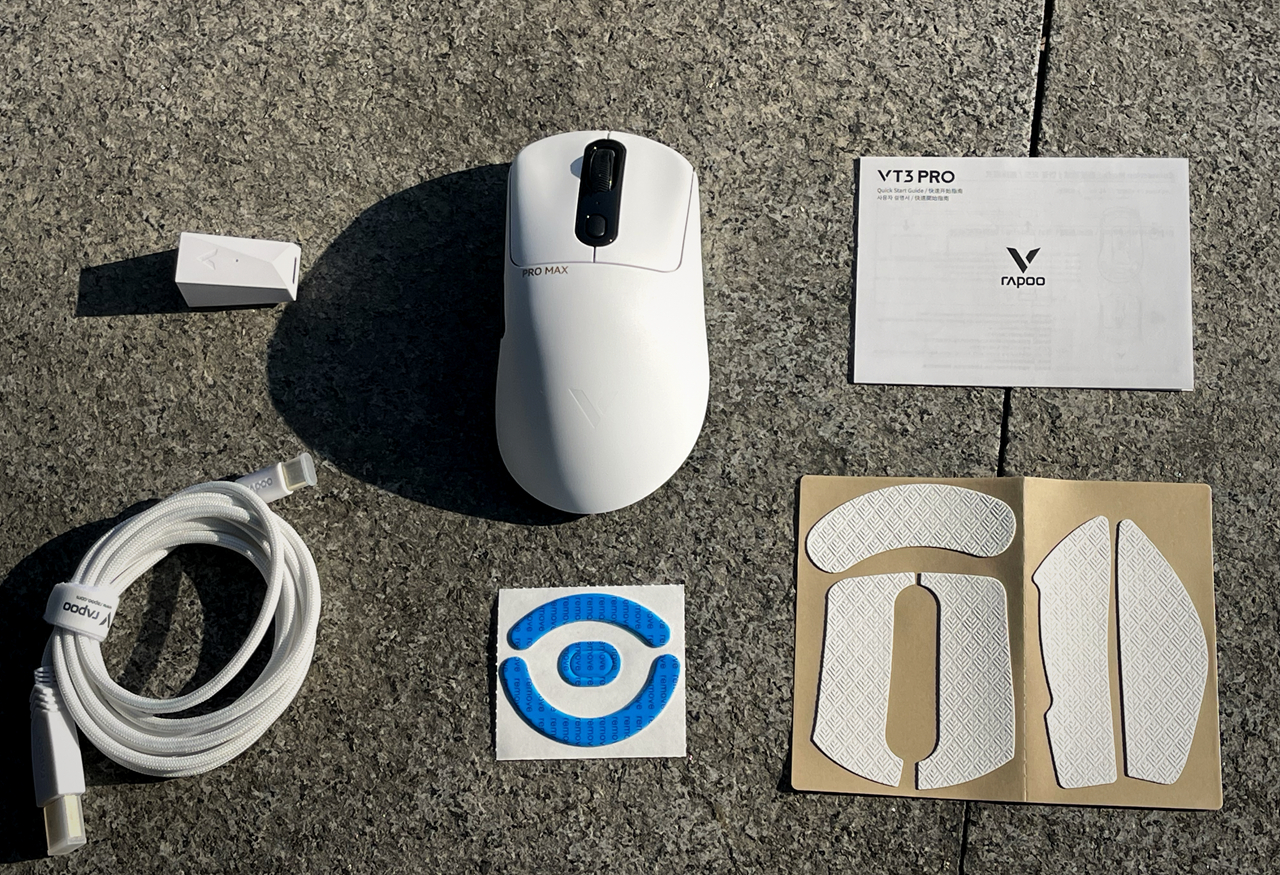 作为游戏鼠标,VT3 PRO MAX配件非常丰富,远超办公鼠标。盒内主包含鼠标本体、充电线、无线接收器底座,说明书。一般鼠标不常见的配件有脚贴和鼠标全覆盖防汗防滑保护贴。