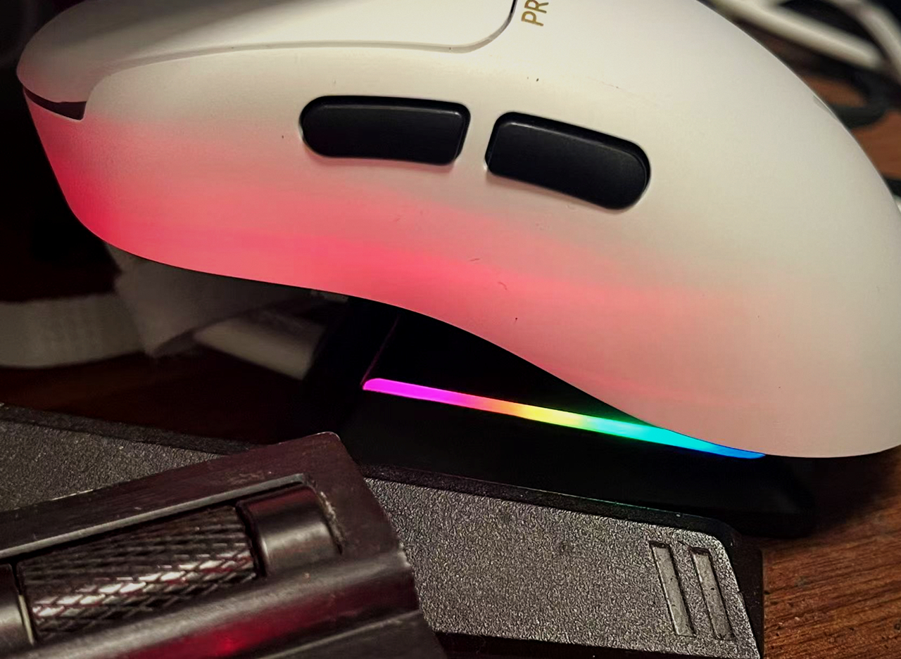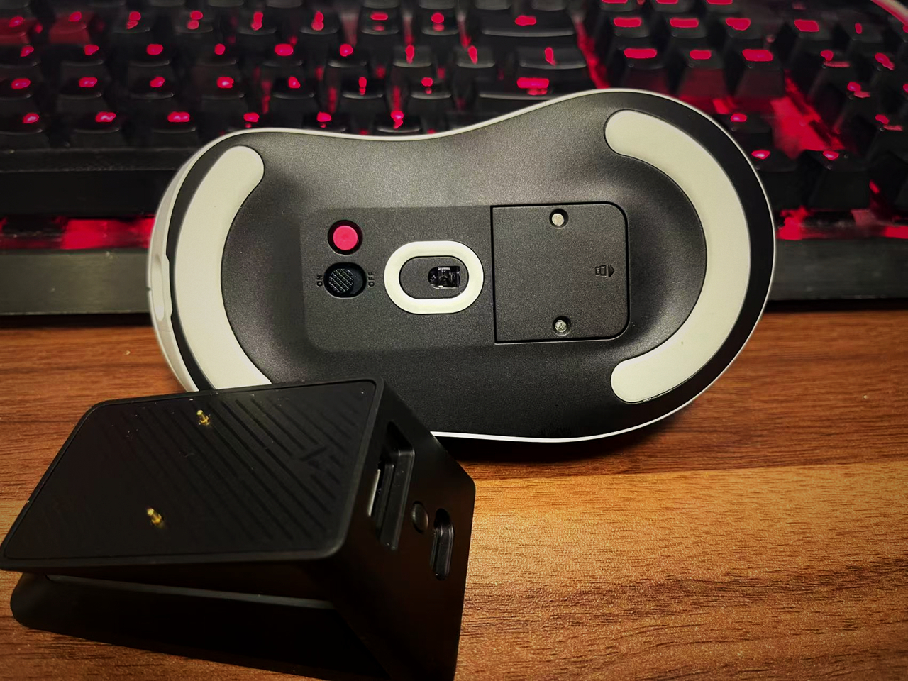 再把鼠标放到P5底座上,就可以实现无线磁吸充电了,这带金属触点的盖板,就是鼠标增重了几克的原因。