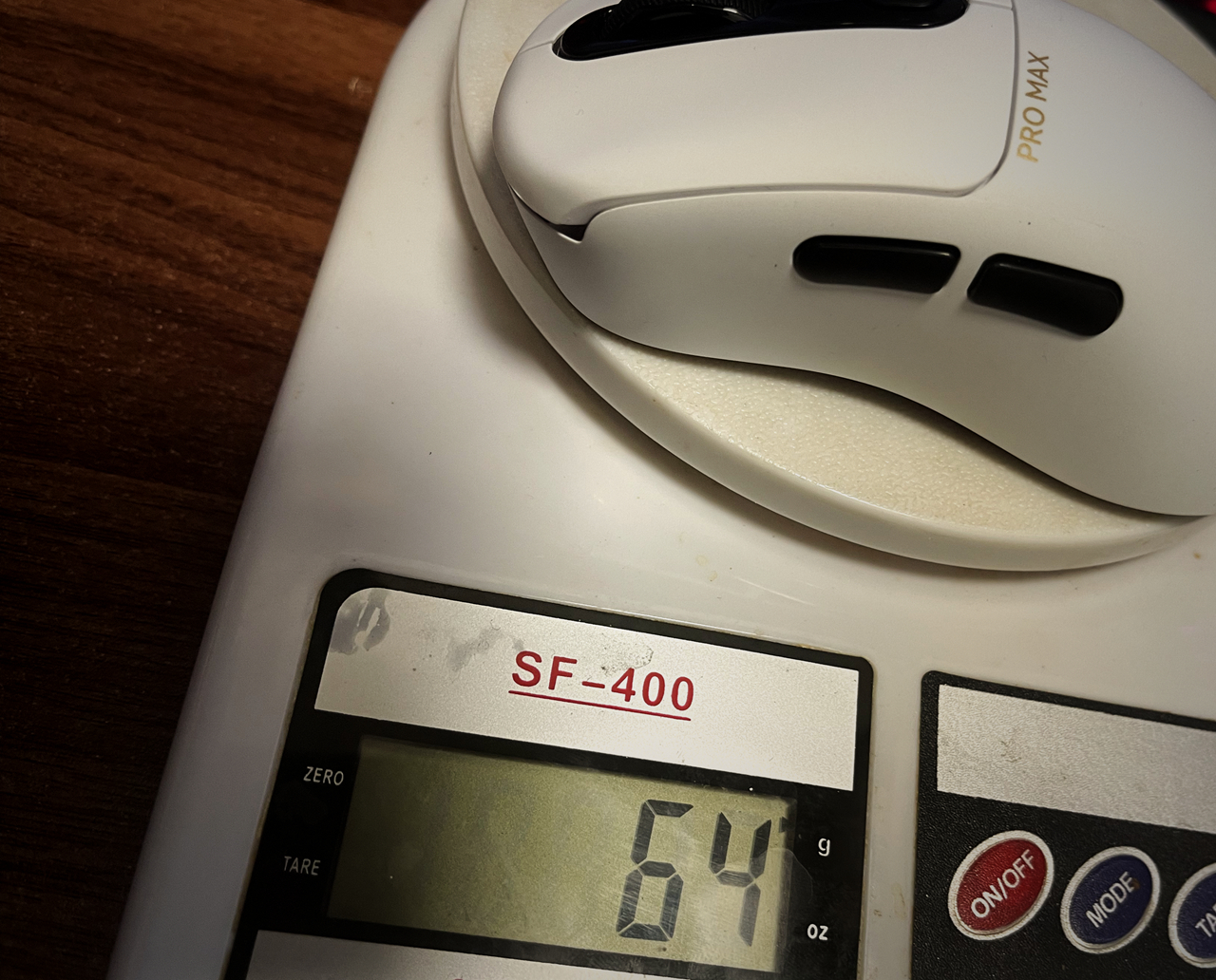 完美的人体工程学设计,加上仅64g左右的重量(此处称重比官网数据略重,内有玄机,随后揭晓。 )