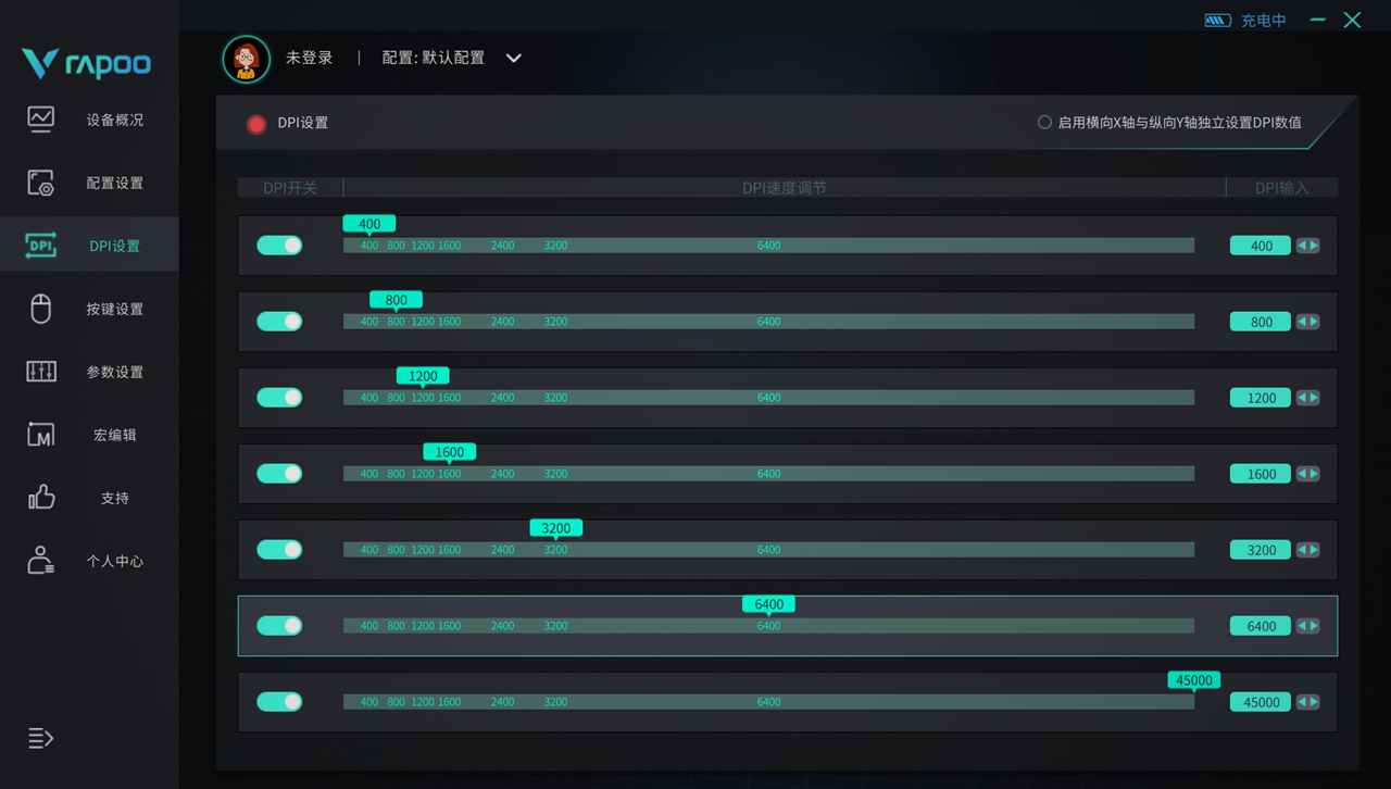 更重要的是,DPI的X/Y轴能独立设置,拥有两种精度单位设置:10精度为单位可调(10-10050DPI区间),50精度为单位可调(>10050DPI区间)。