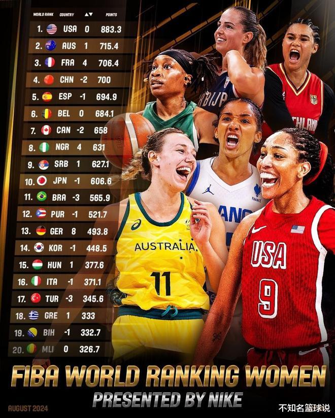 澳大利亚女篮上升一位来到世界第2名,东道主法国女篮借助奥运获得银牌上升4名来到世界第3名。日本女篮下滑一位跌至世界第10名,她们巴黎奥运会3战全败小组垫底出局。