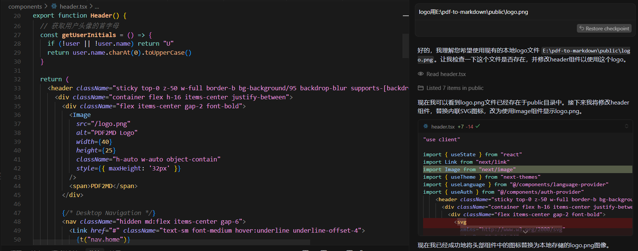 问题一:Logo未自定义解决方案:用Gemini生成LOGO来替换原有的,首先我们把LOGO图片上传到public目录,并让Cursor替换成上传的LOGO即可。