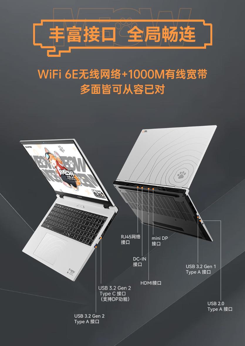 七彩虹COLORFIRE MEOW R16游戏本的接口配备也非常丰富,Mini DP、HDMI 2.1及USB-C接口一应俱全。这些接口不仅可以满足你日常的游戏和娱乐需求,还能在学习和办公时提供很大的便利。比如,你可以通过这些接口连接外接显示器、投影仪等设备,方便你在学习时查阅资料、在展示时进行演示。而且,这些接口还支持4K 120Hz视频输出与PD 100W快充,让你的设备充电更快,使用更方便。