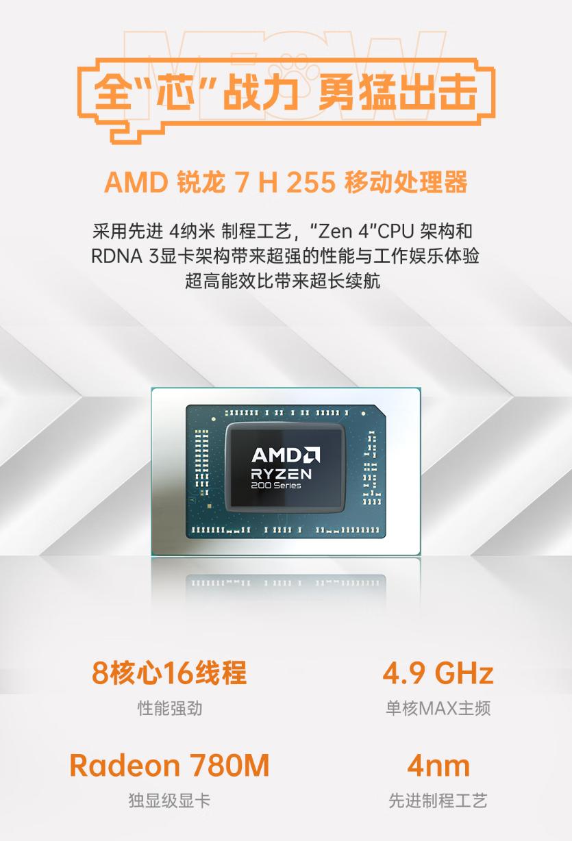 它搭载了AMD最新的锐龙7 H 255移动处理器,8核16线程的配置,最高加速频率可达4.9GHz,还配备了一颗AMD Radeon 780M集显。