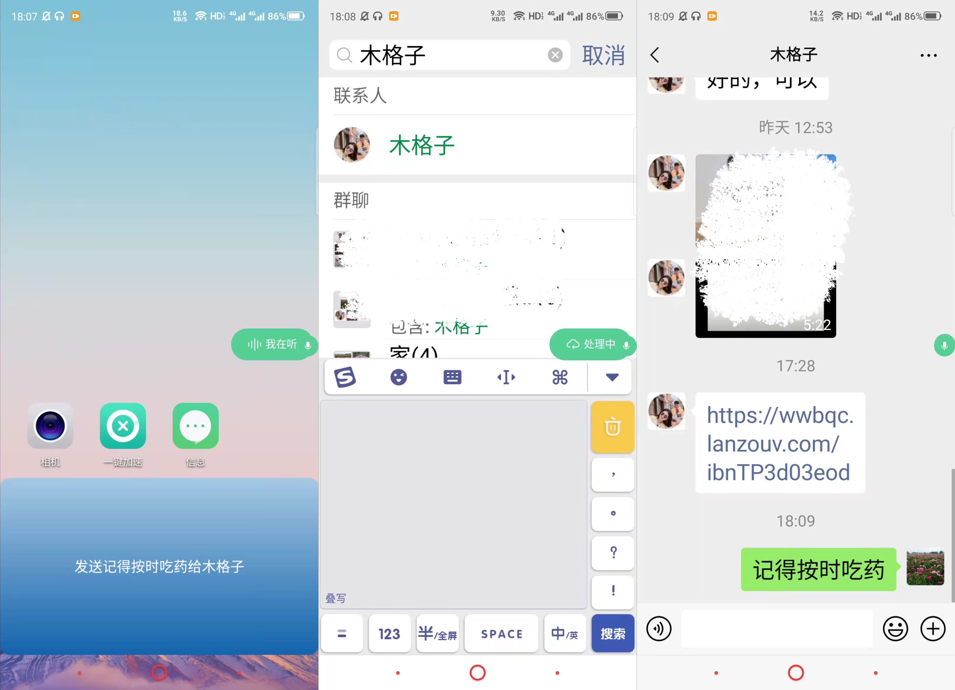 好了,言归正传,老人用手机都不是很顺手,所以在给我妈装上煎饺App后,我让她自己试了下,给我发消息再也不需要盯着屏幕找图标——搜索——然后打字或者语音发消息了,现在只需要点开屏幕旁边的煎饺App唤醒按钮,说出“给XXX发XXX”,剩下的全部交给煎饺App就OK啦,然后消息就发出了,简单快捷!