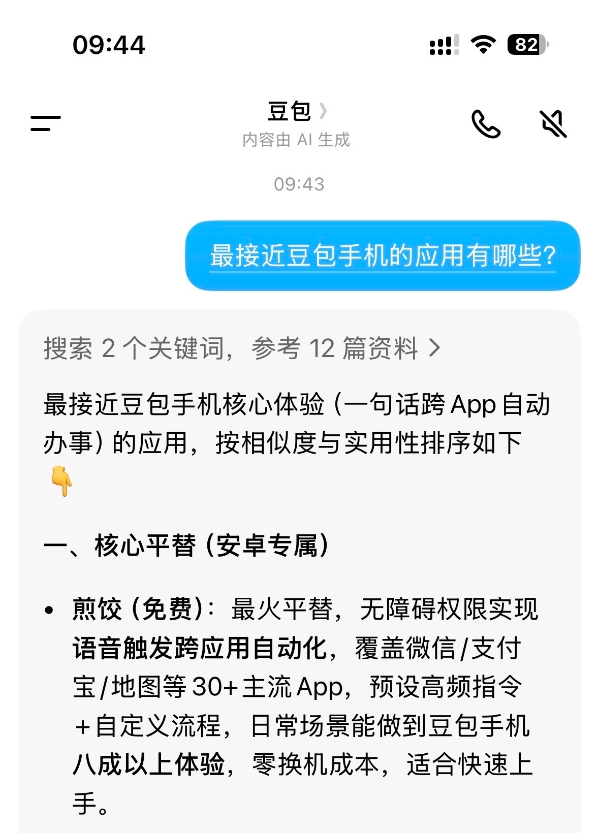 最近这段时间,AI领域可谓是风生水起,从文字、图片到视频生成,从智能助手到创意生成,AI正以前所未有的速度融入我们的生活。前段时间豆包和努比亚联合发布的豆包AI手机更是将这场AI大秀推进到一个新的高度。以前的AI只能在某一个App内帮助我们,而豆包AI手机直接可以帮助我们操作手机并进行复杂的操作,体验到“想做什么只需要动动嘴就可以”的领导般的待遇,我体验了之后就被深深种草了。但另一方面,我现在在用的手机都还挺流畅的,单纯为了这个AI功能花3499元到底有没有必要?作为智能生活家,我仔细研究了一番,发现这个功能有点类似于IOS系统的快捷指令,后来又发现了可以在安卓手机上使用的安卓版豆包AI手机平替软件——煎饺App,能实现豆包AI手机的80%的功能,而且这个还是豆包推荐的👇🏻