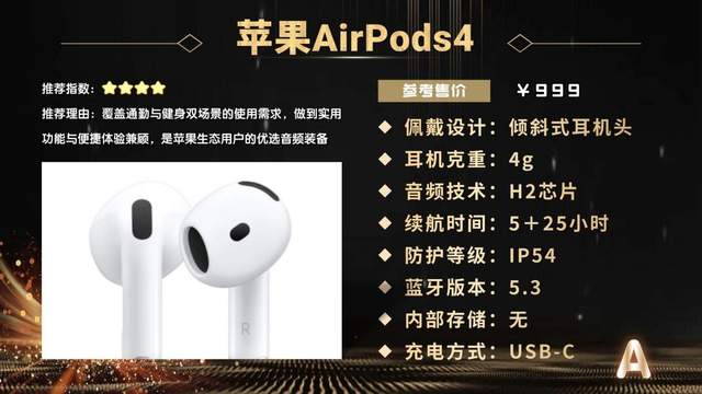 苹果AirPods4延续品牌一贯的舒适调校风格,覆盖通勤与健身双场景,功能实用、体验便捷,是苹果生态用户的优选音频装备。