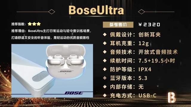 BoseUltra主打日常运动与中轻度训练场景,依靠创新耳夹式结构与开放听音架构,带来舒适又安全的聆听体验,是轻运动人群的优质音频搭档。