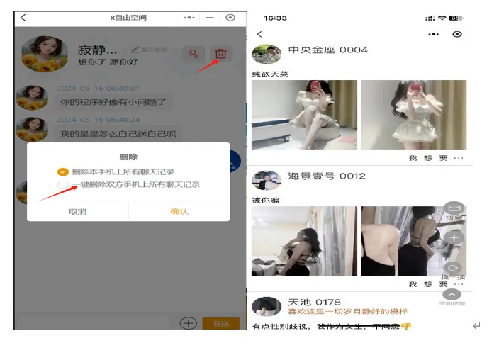 5、一键删除自己和对方手机上聊天记录的能力,任-一方删除记录则双方手机上记录都会消失,并且是永久消失,服务器上也不会保留,无法恢复。保证熟人、陌生人交流过程中产生的暖昧信息可以得到及时清除,防止聊天记录泄露。
