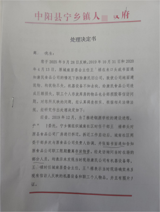 目前,康民公司已向中阳县行政单位提交行政复议申请,请求撤销镇行政单位2025年12月25日作出的《处理决定书》,确认强拆行为违法,责令其调查并赔偿财产损失。