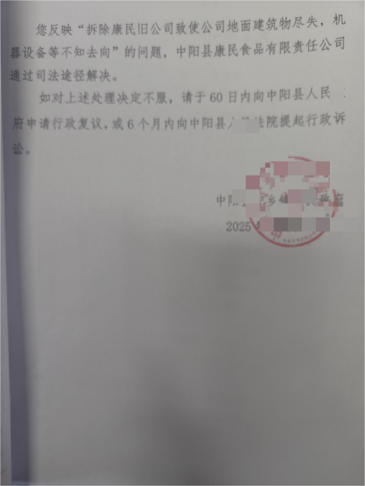 此前,康民公司已历经多轮信访:2020年向县长田某平反映,2021年向县长孙某飞提交材料,2023年、2025年两次向相关部门单位反映,均无实质性结果;2025年9月向县信访局提交材料后,镇行政单位承诺11月28日前答复,截至12月仍无回应。