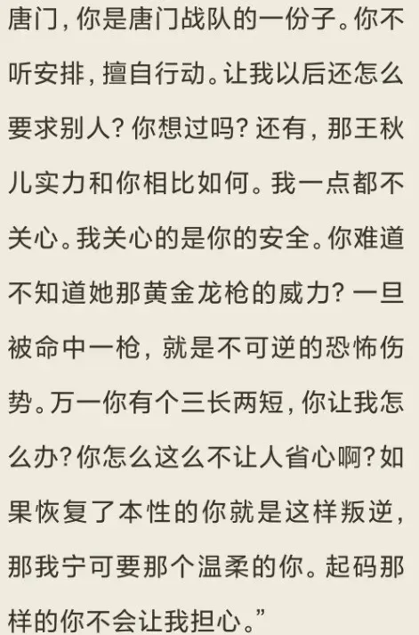 他根本没有站在女友的角度去考虑,为什么冬儿冒着被黄金龙枪伤到的危险,也要和王秋儿来一场比赛。还不是因为心里那口气咽不下,根本原因就是霍雨浩没有给足安全感。不过动漫应该会改编一点,希望不要和原著里一样。