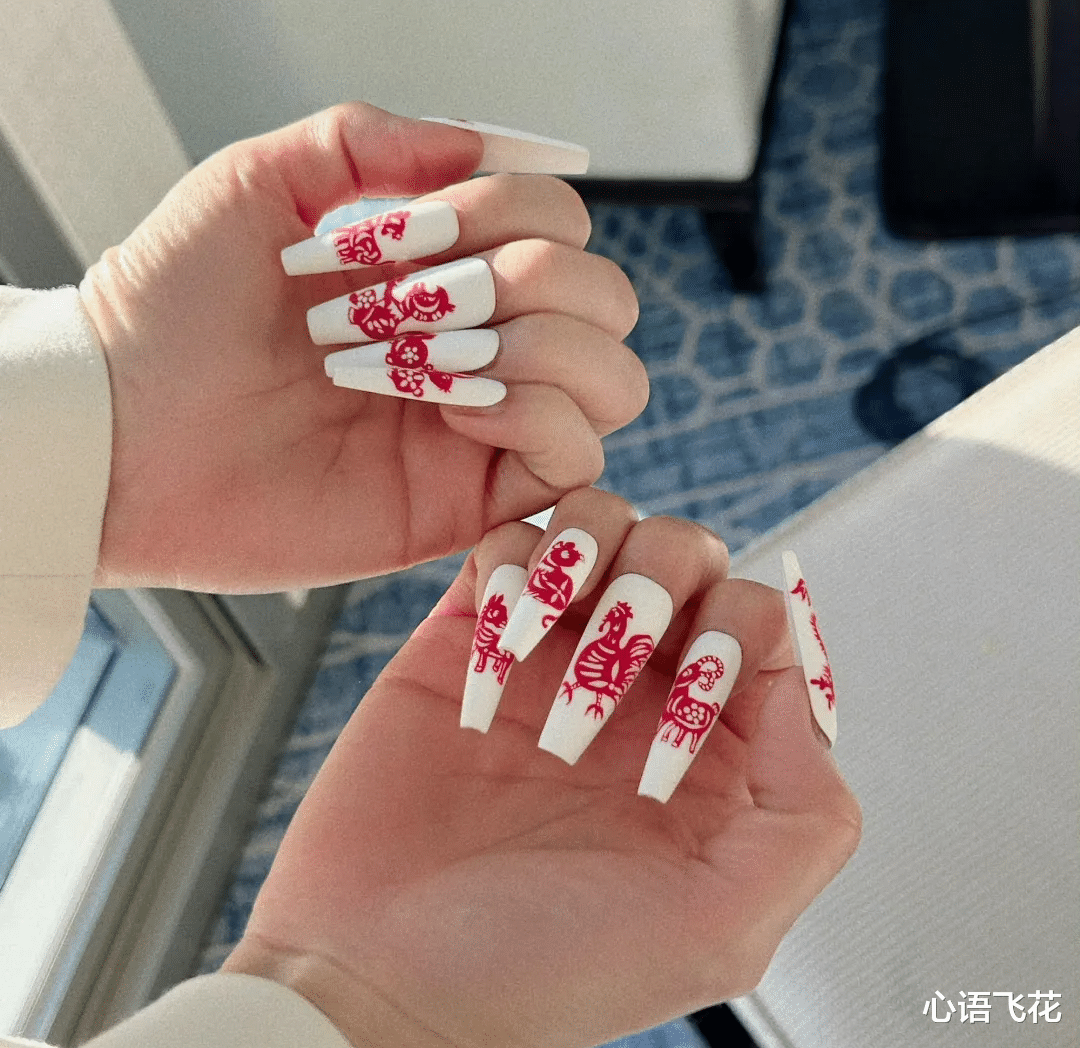 曾黎把指甲放在镜头前面,指甲上有红色剪纸样的东西。拉近一看,原来这还真和剪纸有关。曾黎说,给大家分享一下我刚做的十二生肖剪纸美甲。