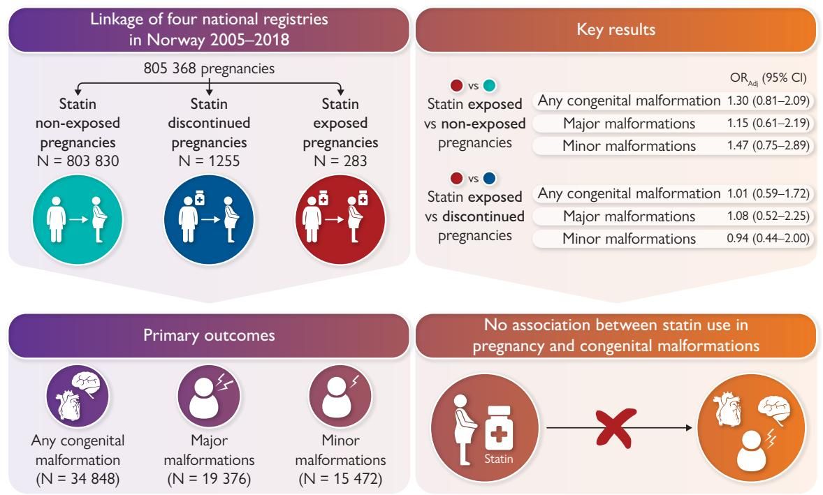 论文信息标题:Statin use in pregnancy and risk of congenital malformations: a Norwegian nationwide study.