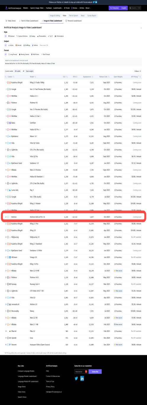 加州圣地亚哥和北京,2025 年 12月 19日——CreateAI(OTC:TSPH)打造的全球首个专注于动漫的AI视频生成平台Animon,在Artificial Analysis发布的Image to Video Leaderboard榜单中杀出重围:在入榜的40款全球主流视频模型中,Animon跻身第21名,以绝对优势力压OpenAI Sora、Runway、Pika、Midjourney等国际知名品牌,更是榜单中唯一出身自动驾驶原始团队、能与一众国际顶尖视频模型公司同台抗衡的产品。
