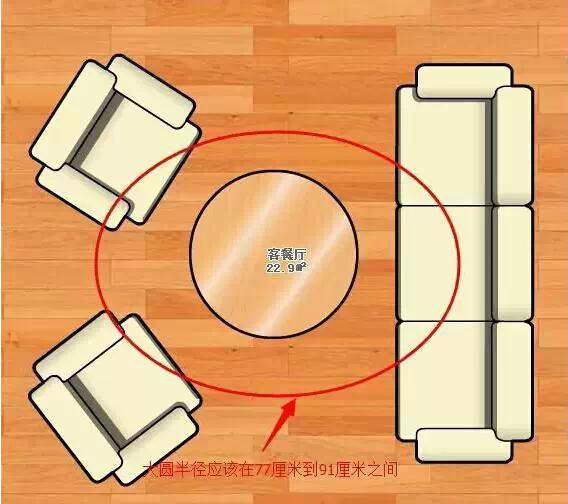 上图展现了客厅家具布局,当然你也可以根据自己的需求添加或减少家具。为了保持客厅道路的通畅,中间的大圆半径应该在77厘米到91厘米之间。凳子与凳子之间的距离最好能符合人与人之间的交谈习惯。