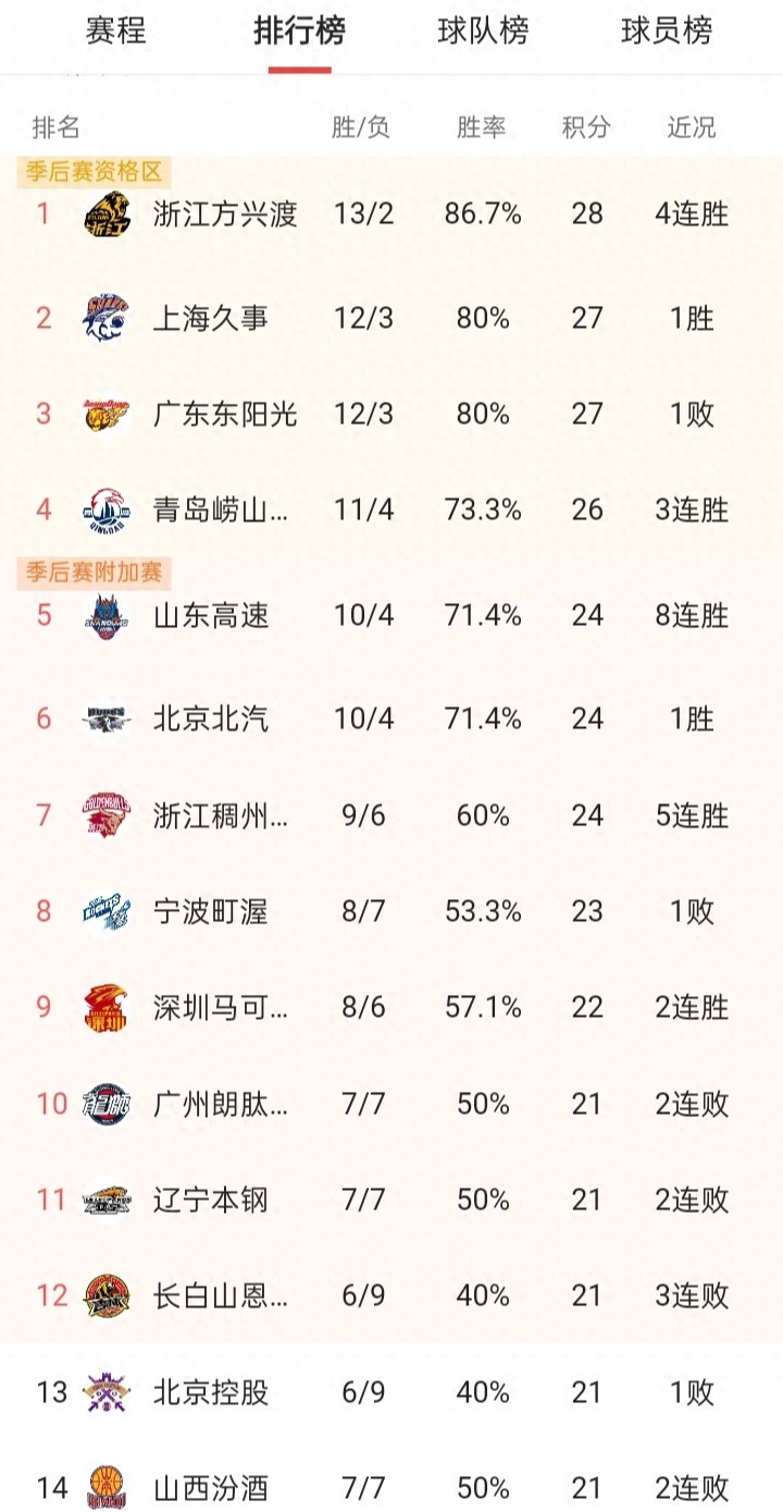 浙江男篮,上一轮比赛面对广州龙狮,89:74拿下胜利,换帅调整成功,最近拿到一波5连胜,目前9胜6负,排名第7,球队场均89.3分,38.7个篮板,21.3次助攻,命中率为45.2%,场均10.3个三分球,外线命中率35.6%,失误12.5次,罚球命中率80.3%,场均失分83.1分,浙江队团队配合效率更好,整体性更强,经验也丰富。