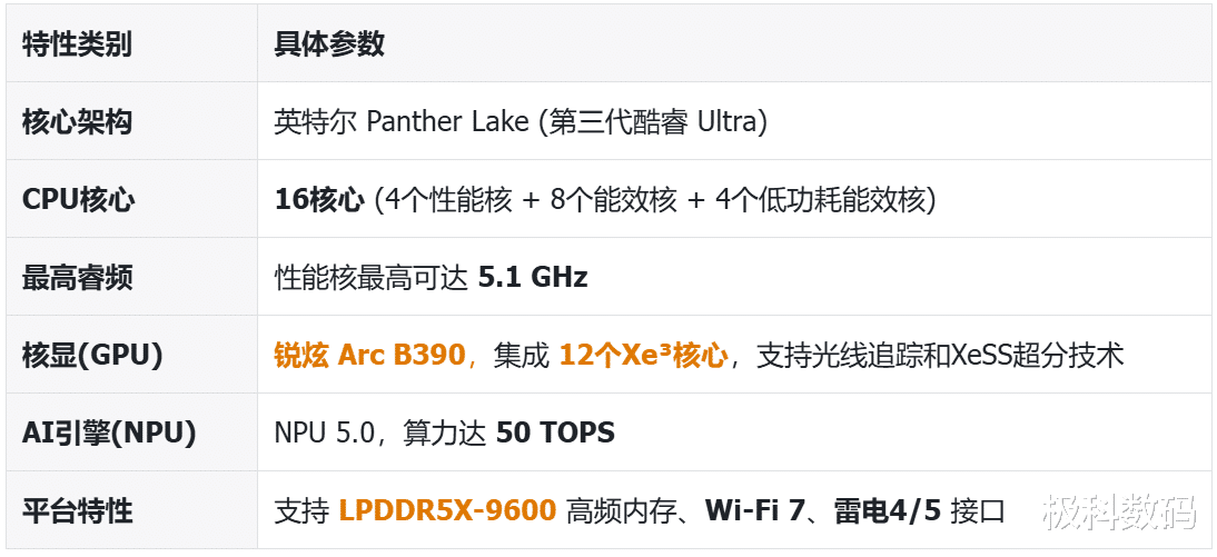 在聊这款笔记本电脑之前,我们先来看看新款 酷睿Ultra X9 388H 处理器的核心规格: