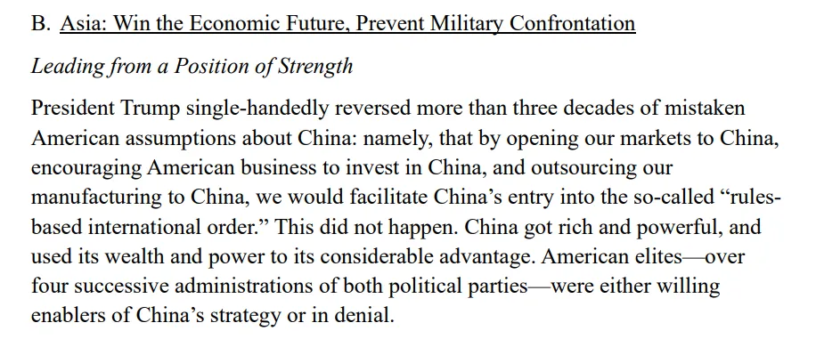 于是在新版NSS的「区域战略」部分,把美国的重心重新拉回美洲,把「西半球」(the Western Hemisphere)列为第一项,不惜把亚洲下调到第二,欧洲下调到第三位,甚至连美军诱捕器的中东也要下移。要知道在特朗普自己的17版NSS,第一项是「印太地区」,西半球项仅列第5。