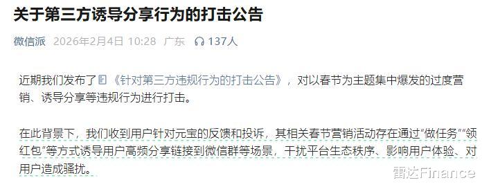 对此,微信官方账号“微信派”当日发布公告称,平台收到用户针对元宝的反馈和投诉,其相关春节营销活动存在通过“做任务”“领红包”等方式,诱导用户高频分享链接到微信群等场景,干扰平台生态秩序、影响用户体验、对用户造成骚扰。