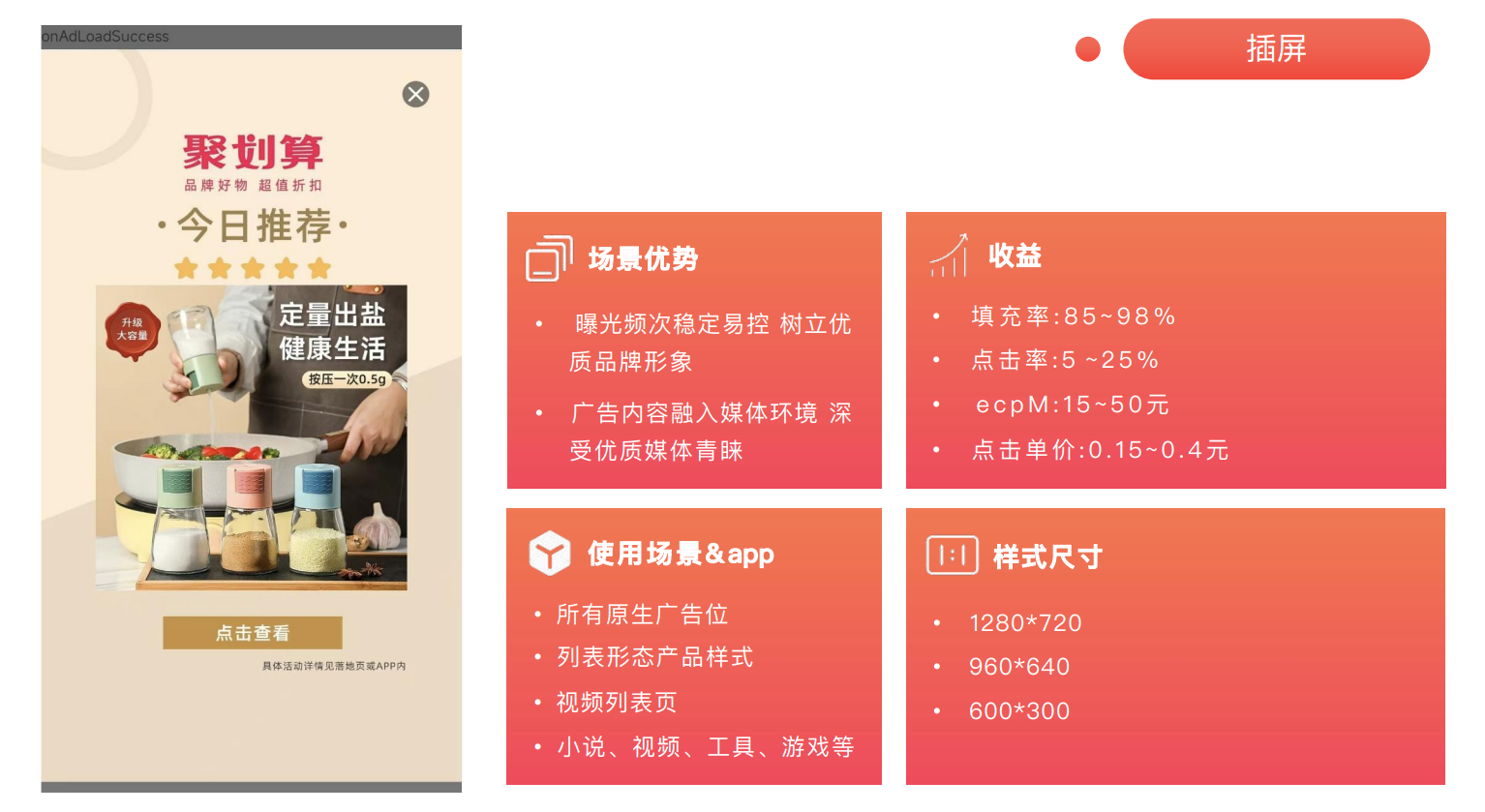 ·开屏广告:适用于所有 APP 的冷启动 / 热启动场景,支持图片 + 视频形式,尺寸覆盖 10801920、7681024 等,点击率 5%~25%,为工具类、视频类、游戏类 APP 带来稳定收益。