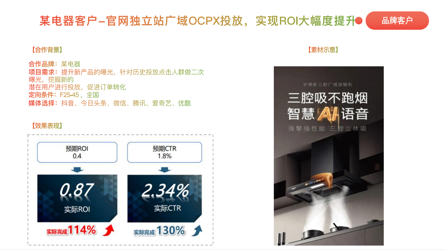 ·某电器品牌:通过 Admore 的广域 OCPX 投放策略,针对 25~45 岁人群在抖音、微信、爱奇艺等多平台定向推广新产品,最终 ROI 达 0.87(预期 0.4),点击率 2.34%(预期 1.8%),超额完成转化目标。