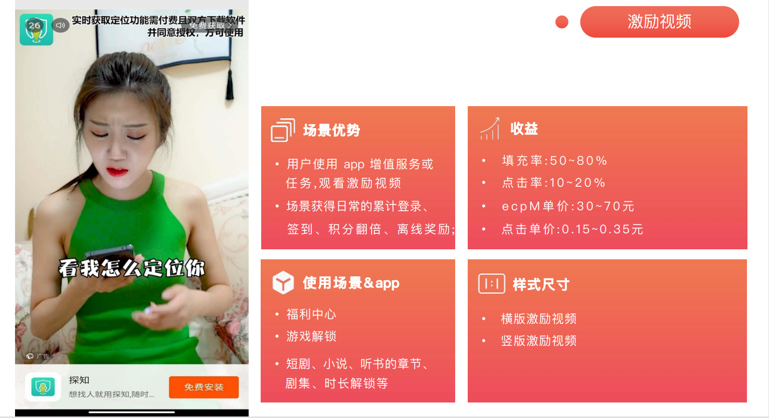 ·激励视频:广泛应用于游戏解锁、短剧 / 小说章节解锁、福利中心任务等场景,用户主动观看率高,点击率 10%~20%,助力休闲游戏、内容类 APP 提升用户留存与变现收益。