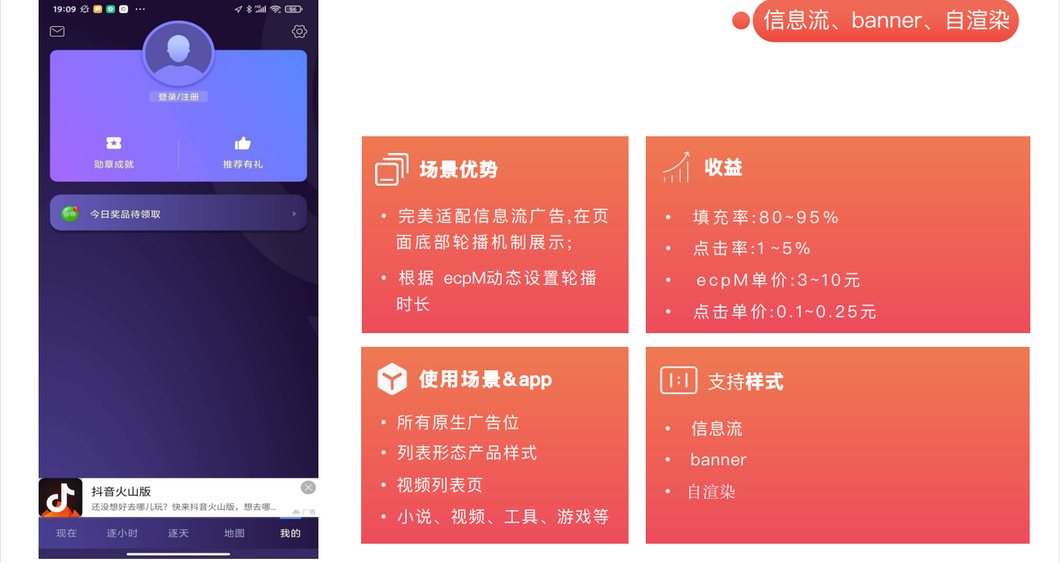 ·信息流与 Banner:嵌入小说、视频、资讯类 APP 的内容列表,通过动态轮播机制匹配用户浏览习惯,eCPM 3~10 元,平衡内容体验与变现效率。