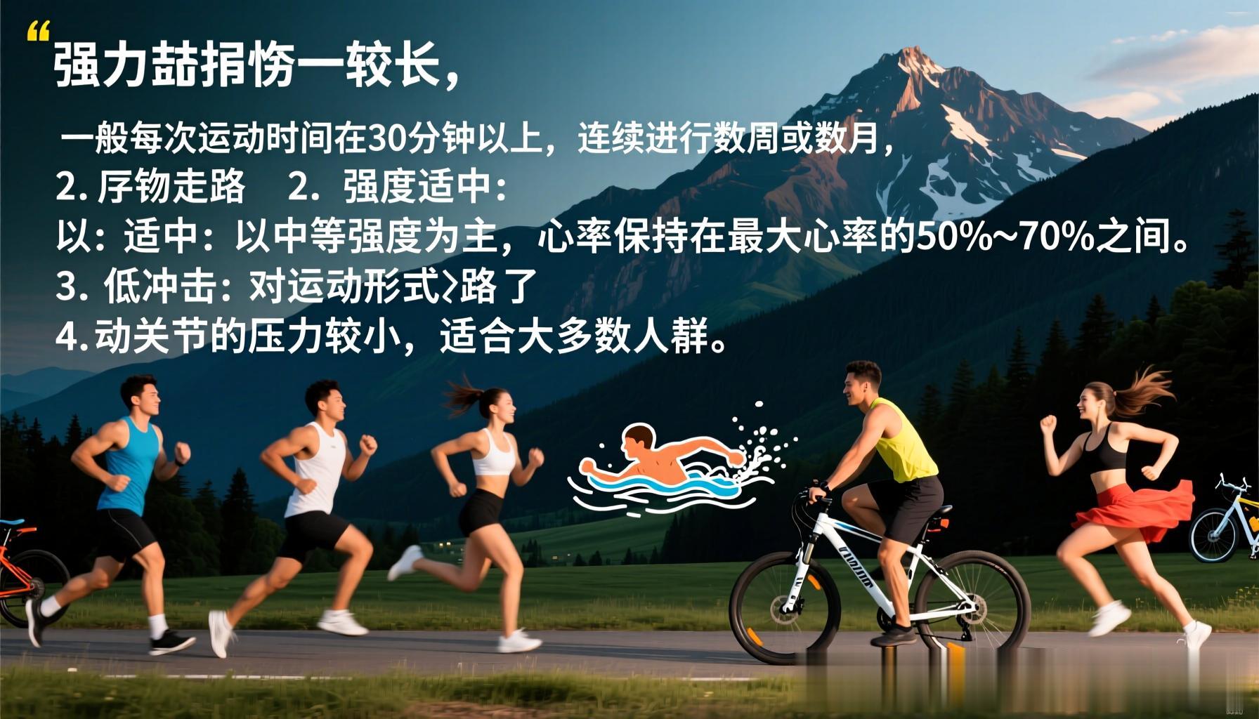 4. 运动形式多样:包括走路、慢跑、游泳、骑自行车、登山、舞蹈等。