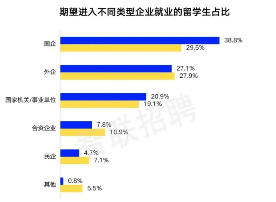 根据近期智联招聘发布的《中国海归就业调查报告》,有38.8%的留学生表示希望进入国企工作,名列各类型机构之首,同比去年上涨9个百分比。有27.1%、20.9%的留学生表示希望进入外企或国家机构、事业单位,排名次之。