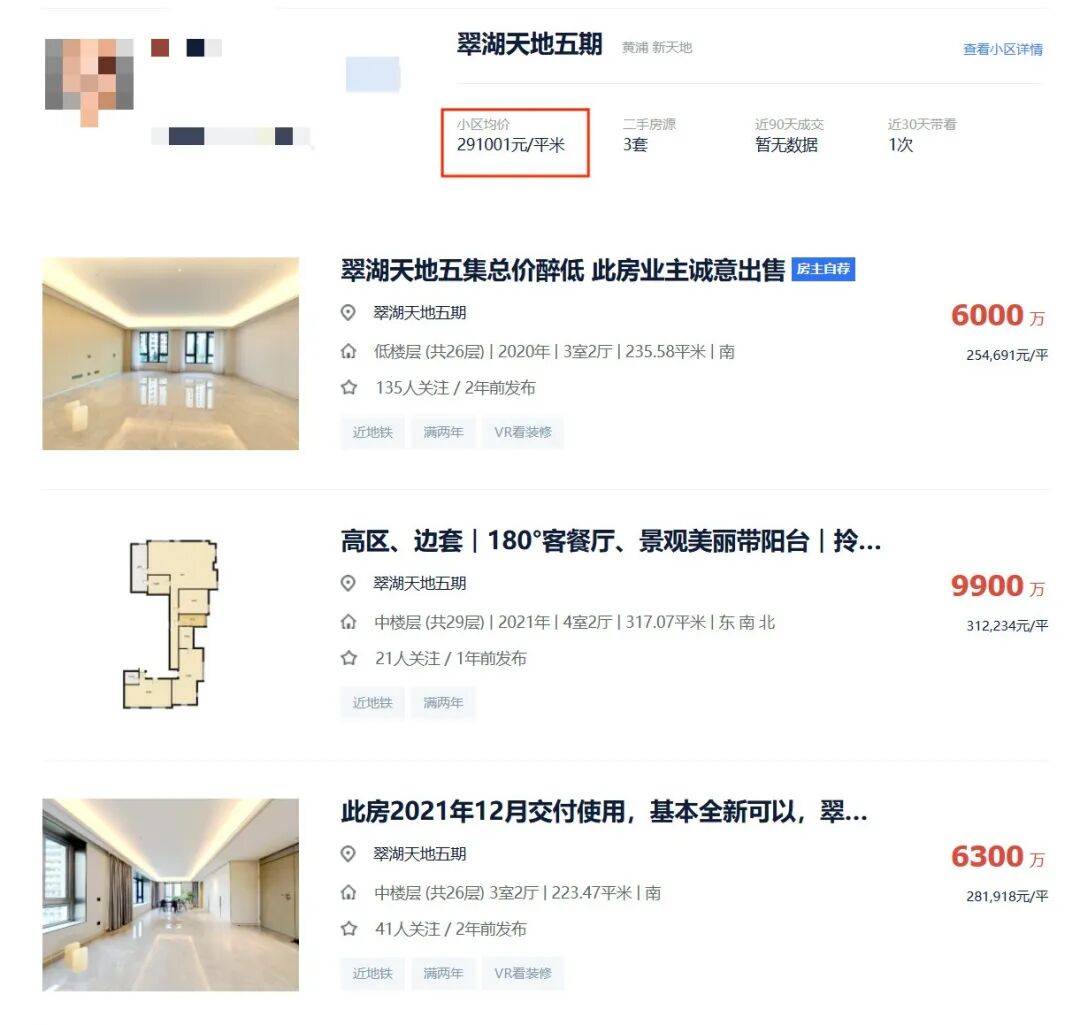 翠湖天地位于上海黄浦区新天地核心区域,是上海的顶豪产品标杆,每套总价数千万元。贝壳找房显示,翠湖天地五期当前的二手房参考价约在29万元/平方米左右。