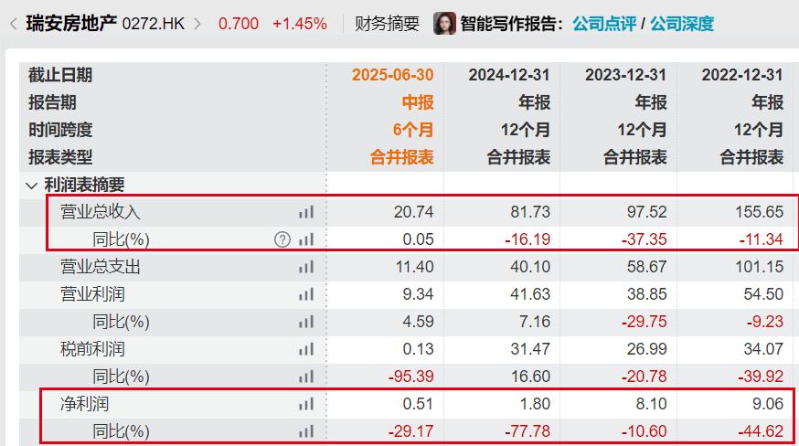自2022年以来,瑞安房地产就陷入了收入、利润双下滑的局面。2022年到2024年,其收入从156亿元下滑至82亿元,接近腰斩。