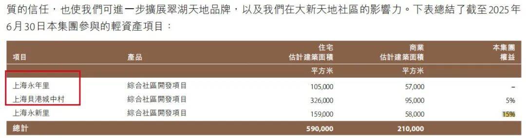 除此之外,瑞安房地产还在2024年拓展了「上海永年里」和「上海贝港城中村」两个轻资产项目。其中,公司不持有「上海永年里」股权,持有「上海贝港城中村」5%股权。