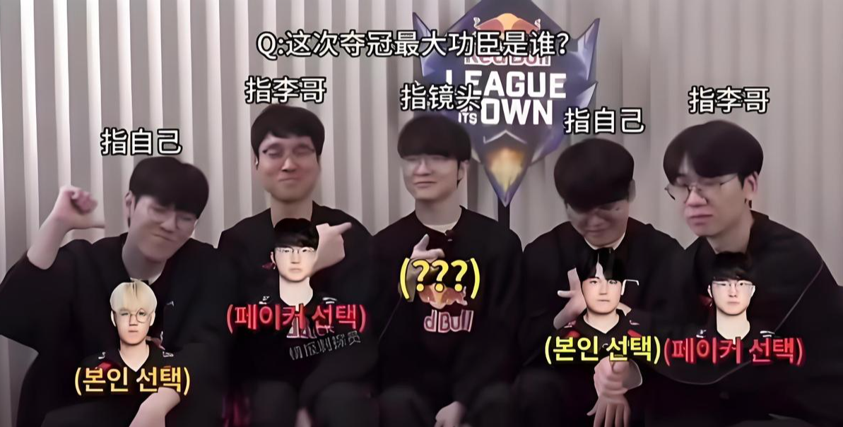 首先主持人问到谁是本次夺冠的最大功臣时,doran和Untara都指向了Faker,而gumayusi和oner则是指向了自己,至于faker则是非常独特,直接指向了镜头之外的粉丝,而gumayusi也是心领神会,直接现场解读了faker的操作:托粉丝的福获得了冠军。