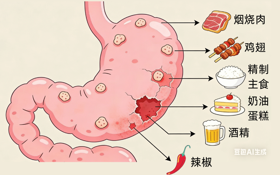 红肉、加工肉类(譬如香肠、火腿)还有高脂肪、高糖之类的食物,要避免食用辛辣,油炸、肥腻这类刺激性食品,少喝酒。