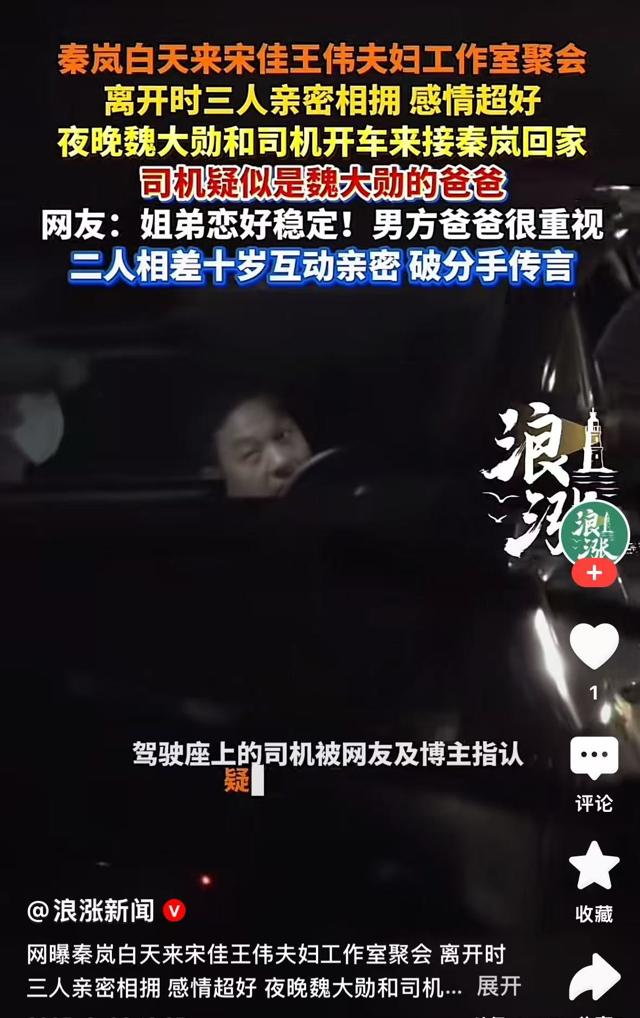 浪涨新闻——秦岚自天来宋佳王伟夫妇工作室聚会离开时三人亲密相拥 感情超好夜晚魏大勋和司机开车来接秦岚回家司机疑似是魏大勋的爸爸网友:姐弟恋好稳定!男方爸爸很重视二人相差十岁互动亲密 破分手传言