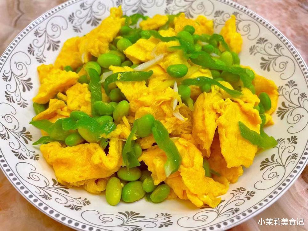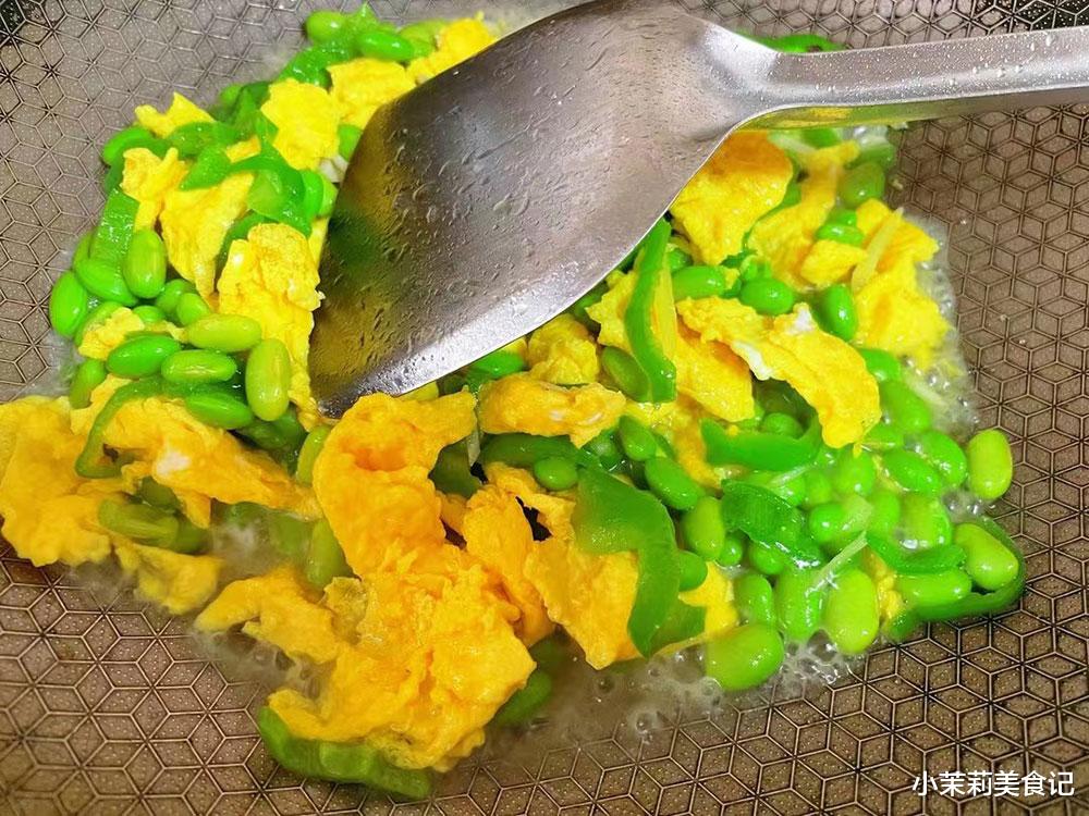 4、毛豆放进去,加点蒜,生抽,一点热水,焖到熟透,尖椒倒进去,鸡蛋也重新下锅,加点盐,炒入味后关火。