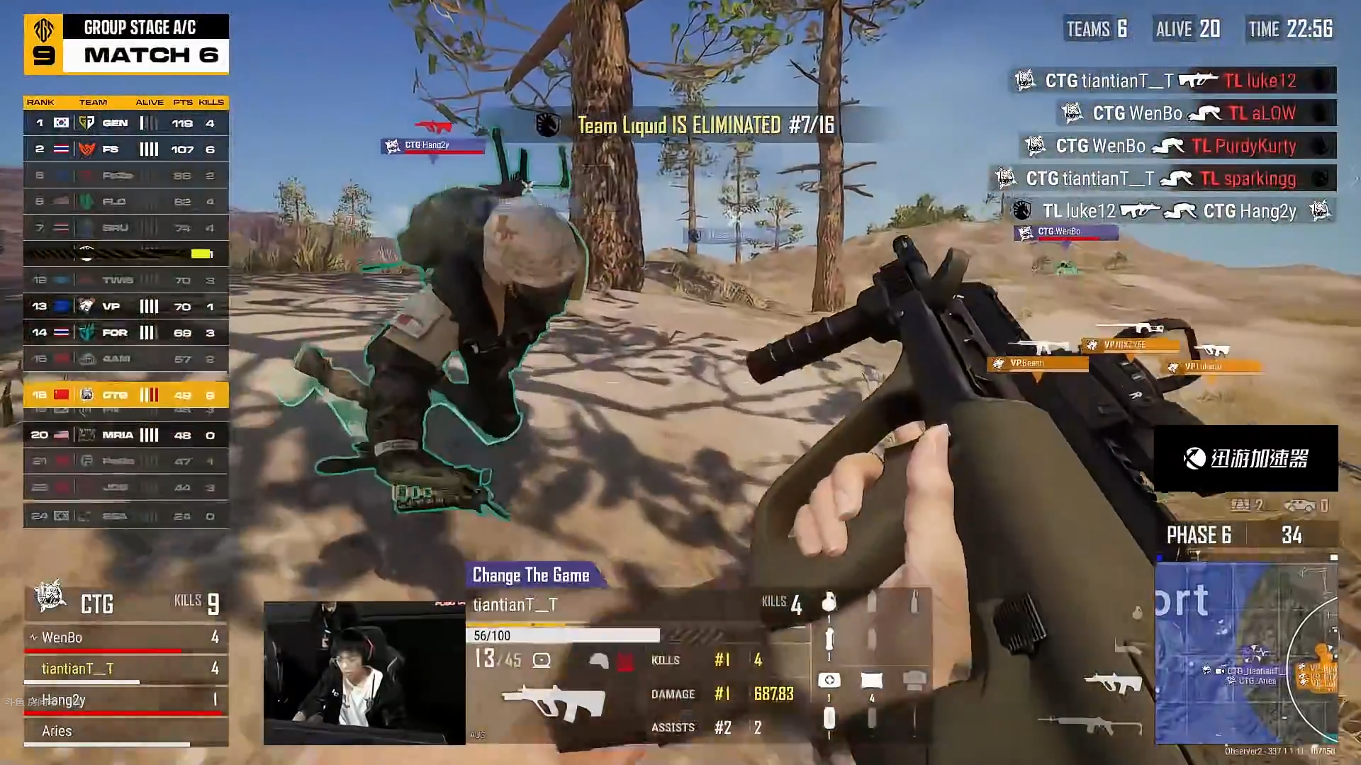 小组赛最后一场刷了个南部圈,开局不久一些头部队伍就快乐起来,一圈Faze下班,GEN和BRU各掉两人,GEN两人好像还不能拿牌子复活了,阶段4圈形刷新,PeRo盲扎进来吃到了一个圈边的位置,FLC想偷4AM被FS偷了背身,4AM反应过来后反打了一波FLC,但后续4AM配合失误还是被FLC拿下。阶段6圈形刷新,JDG和PeRo已经被淘汰出局,CTG开始发力清边带走了TL,咱们这边人都是能扶起来的。