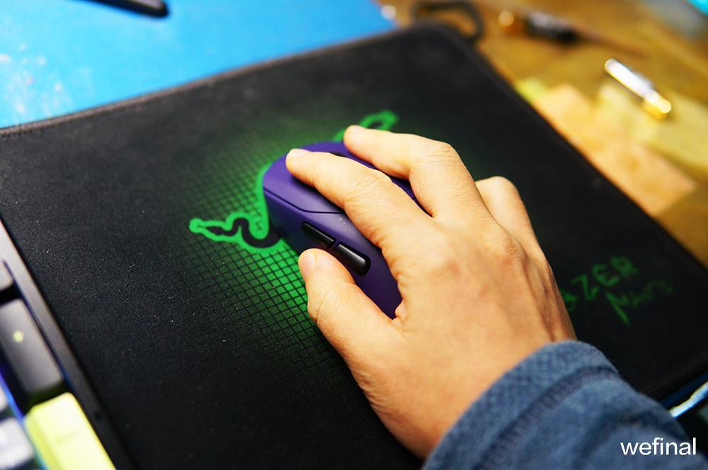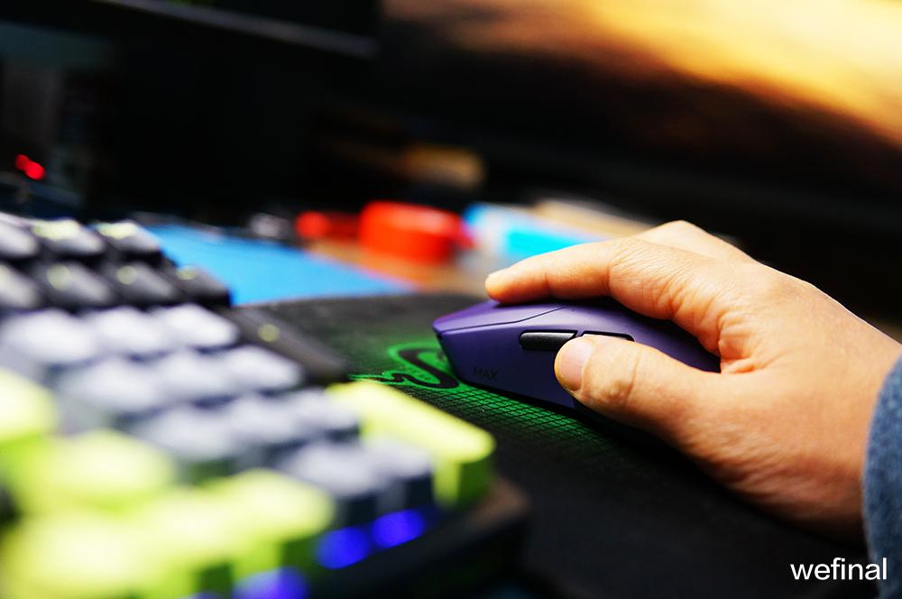 外观上,鼠标线条流畅利落,侧腰内凹的设计极具辨识度,搭配尾部加宽的平缓弧度,不仅塑造出硬朗的电竞风格,更在功能上贴合多元握持需求。宽体三角区为发力提供了精准支点,大小鱼际能轻松掌控鼠标,拇指和小指自然摆放于内凹侧腰,无论是游戏中快速提拉还是微调,都能灵活应对。尾部的品牌 LOGO 采用低调的哑光处理,没有多余的灯光污染,兼顾了办公场景的实用性。