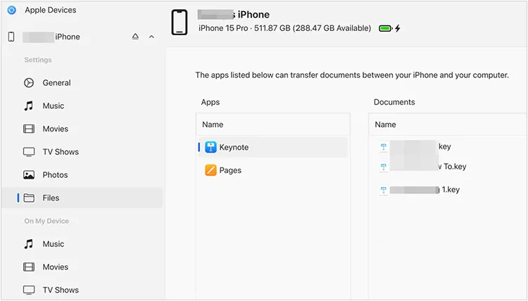 步骤二:打开“Apple 设备”应用。您的 iPhone 应该会出现在侧边栏中。然后点击左侧面板中的“文件”。您将看到 iPhone 上已安装的应用列表。