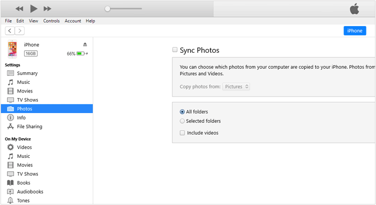 步骤 3:在 iTunes 中,点击左上角的设备图标选择您的 iPhone。在左侧边栏中,选择您要传输的内容类型(例如,音乐、电影、电视节目、照片或图书)。