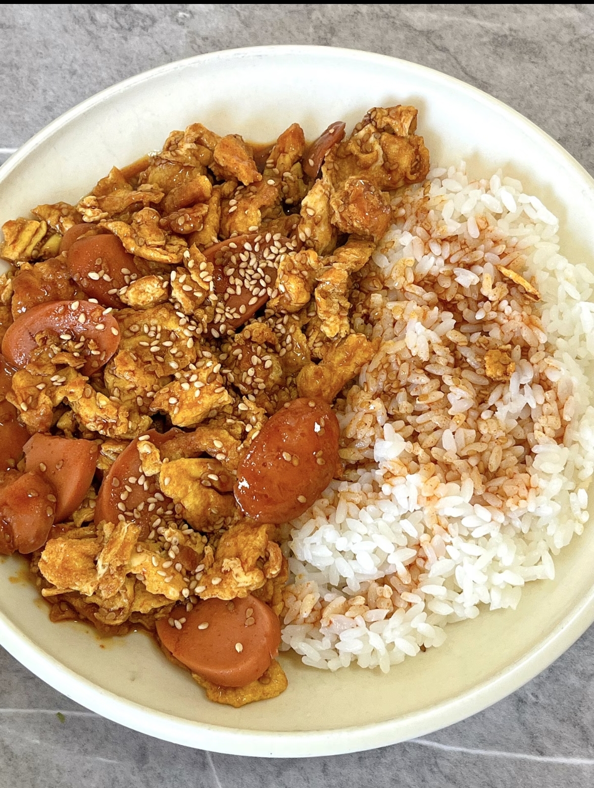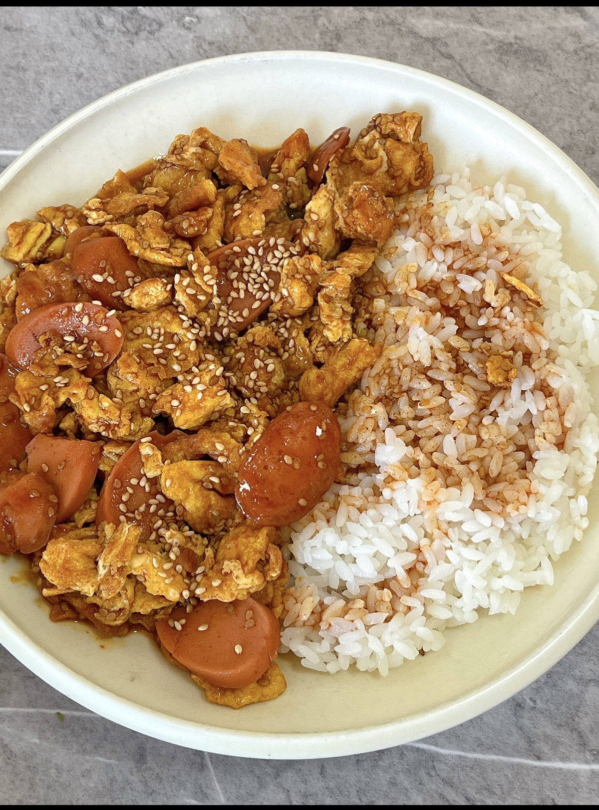 当这一锅冒着诱人香气的糖醋鸡蛋火腿盖在热腾腾的白米饭上时,你的快乐就来了。不用讲究什么摆盘,直接拿起勺子,狠狠地搅拌均匀。看着浓郁的酱汁渗透进每一粒米饭,那种满足感无法言喻。夹上一大勺送入口中,酸甜的酱汁在舌尖炸开,伴随着鸡蛋的嫩、火腿的韧,还有米饭的甘甜,口感丰富到爆炸。
