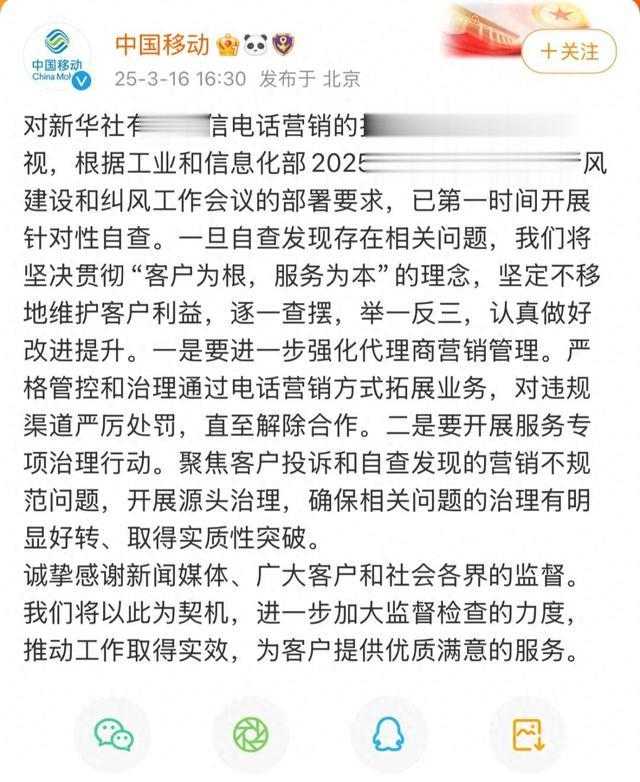 @中国移动 3月16日通报,对新华社有关通信电话营销的报道,公司高度重视,根据工业和信息化部2025年信息通信行业行风建设和纠风工作会议的部署要求,已第一时间开展针对性自查。一旦自查发现存在相关问题,我们将坚决贯彻“客户为根,服务为本”的理念,坚定不移地维护客户利益,逐一查摆,举一反三,认真做好改进提升。一是要进一步强化代理商营销管理。严格管控和治理通过电话营销方式拓展业务,对违规渠道严厉处罚,直至解除合作。二是要开展服务专项治理行动。聚焦客户投诉和自查发现的营销不规范问题,开展源头治理,确保相关问题的治理有明显好转、取得实质性突破。诚挚感谢新闻媒体、广大客户和社会各界的监督。我们将以此为契机,进一步加大监督检查的力度,推动工作取得实效,为客户提供优质满意的服务。