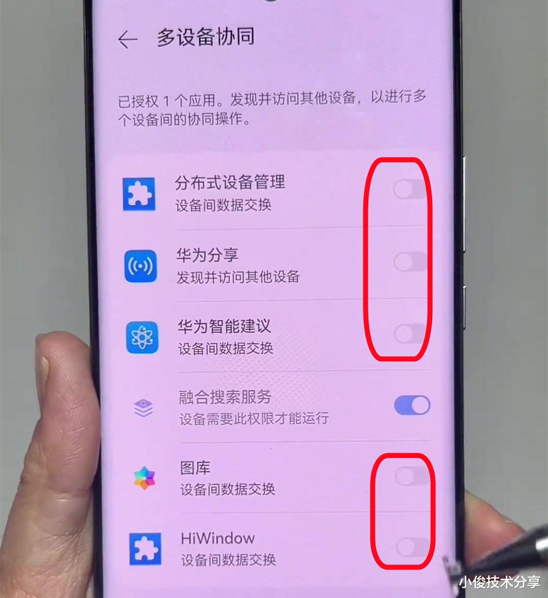 像第一个分布式设备管理,设备间数据交换,这些都要把它关闭掉,以及第二个发现并访问其他的华为设备,也要把它关闭掉,第三个也是设备间的数据交换也关掉,最后一个,设备间设备交换也关掉。把这些开关都关闭之后,别人就无法和你的手机同屏了,那这样你的手机就安全了。