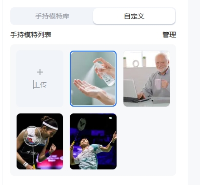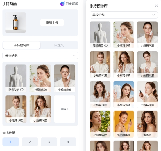 系统内置了多种不同品类的手持模特,例如水杯、美妆、数码产品等。选择与商品属性匹配的模特,生成后的融合度会更高。