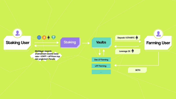 比如在其杠杆挖矿功能中,用户可以存入一些资产(目前以LRT资产为主比如pufETH)等资产,并通过选择2倍杠杆来放大他们的回报,该功能能够将10%的年回报率转化为30%的回报率。而Vaults产品的智能合约管理复杂性,将资金放入流动性池和下游策略,同时安全持有LP通证。