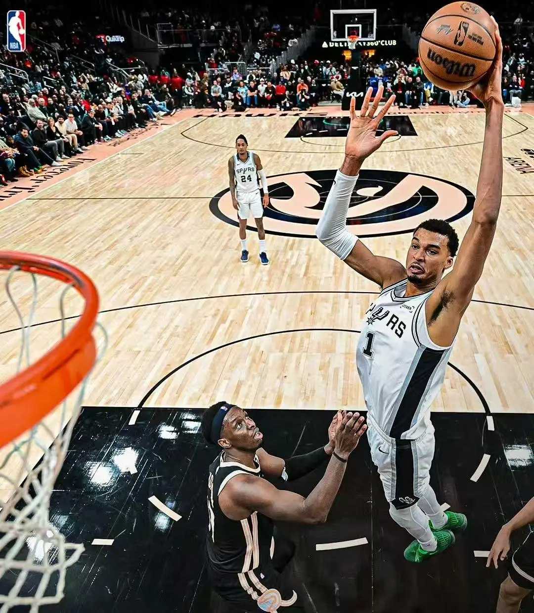 马刺今天打老鹰赢了28分,这已经是他们第五场连胜了。现在战绩20胜7负排到西部第三,超过了湖人。老鹰因为特雷杨没来,虽然输了但还能进季后赛。文班亚马打了21分钟就拿了26分12篮板,马刺这边10个人都至少得了6分,打球人多优势大。