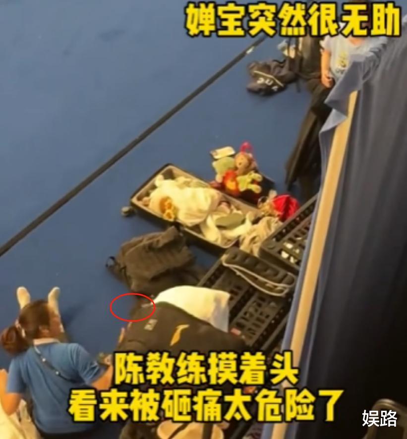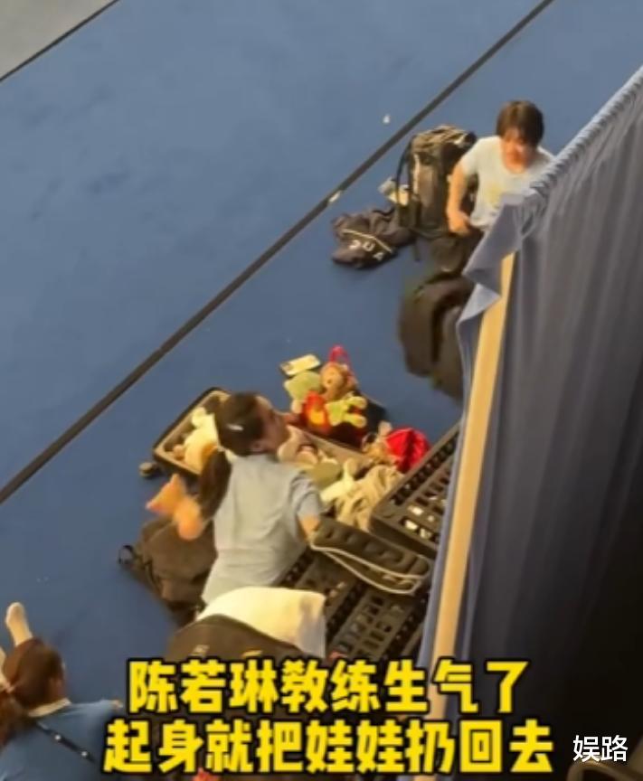 期间,有个粉丝不小心将娃娃砸到坐在场地上的教练陈若琳的脑袋上。