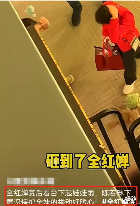 粉丝扔娃娃,不仅砸中了陈若琳的脑袋,还砸中了全红婵。陈若琳非常关心全红婵,担心她受伤,主动伸手制止粉丝的行为。